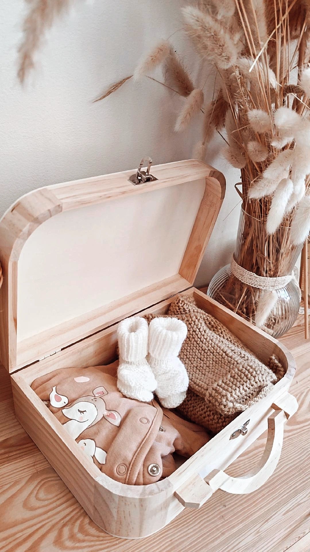 Cette valisette permet de ranger ses premiers chaussons, son bracelet de naissance, sa tétine, ses premiers souvenirs… tout ce qui fait battre votre cœur de parent.