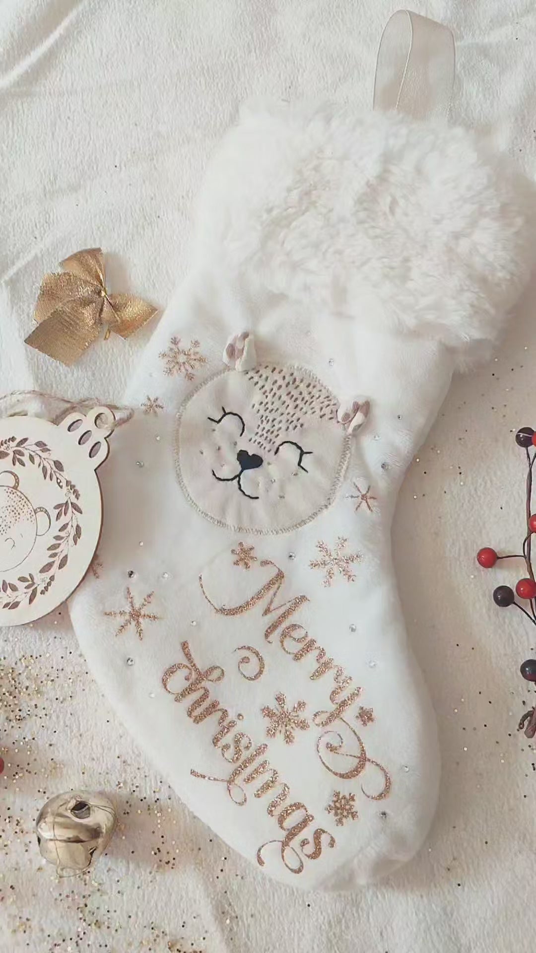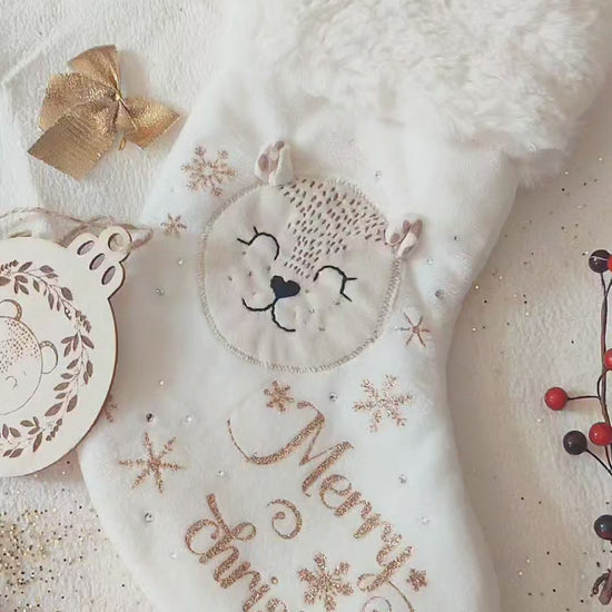 Plongez dans la magie de Noël avec cette chaussette décorative à l’effigie des doudous “Aux Merveilles de Charlotte” 🧸✨
