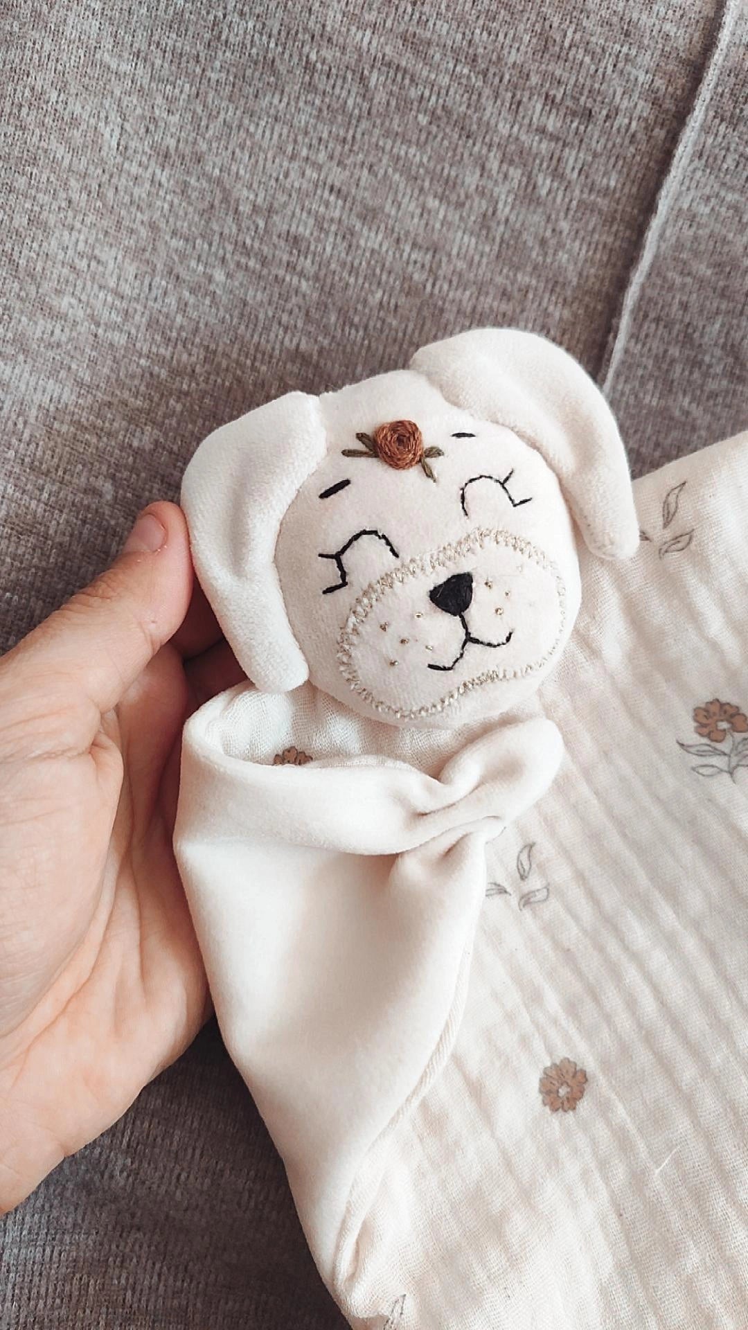 🌼 Offrez à votre bébé un doudou chien unique, doux, personnalisé et fait main.