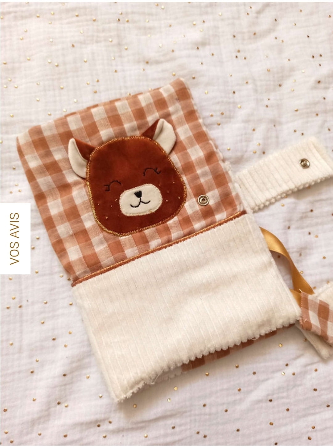 Paré d'une jolie applique animal et également du prénom de l' enfant si vous le souhaitez. Il dispose d'une attache pression pour ne pas s'ouvrir à sa guise. Mais également de 2 rubans pour marquer les pages que vous souhaitez. Rembourré légèrement avec une fine ouate. Et pour finir une large poche est désormais cousue sur le rabat arrière afin d'y glisser ordonnances et autres documents.