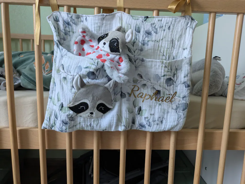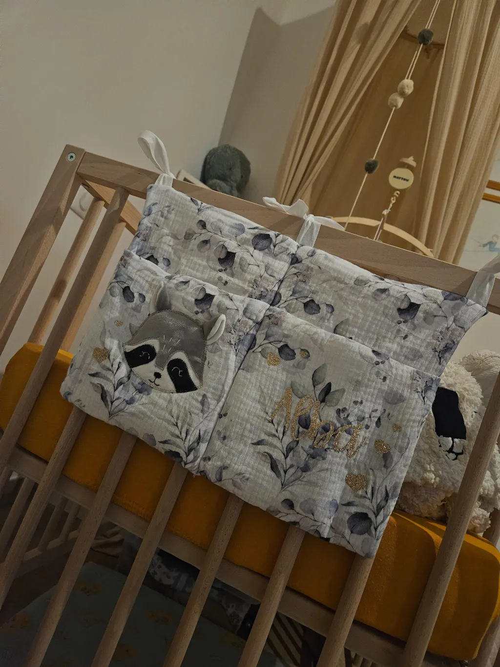 Paré d'une jolie applique animale et également du prénom de l' enfant si vous le souhaitez. Il se fixe facilement et rapidement en 3 points grâce aux liens prévus. Ces deux espaces vous permettent de ranger les tétines, doudous, et autres indispensables de bébé ! Plus besoin de les chercher au moment du couché.